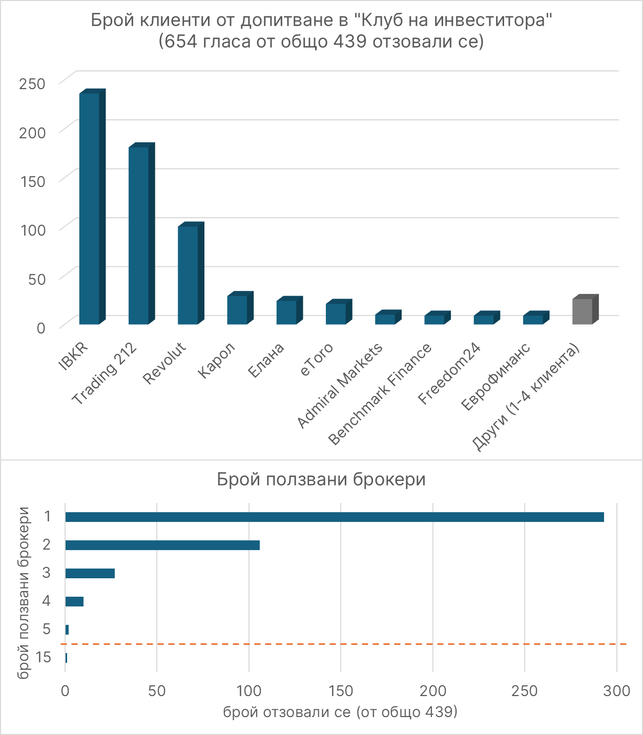 Анализът на допитването е направен 28 ч. след публикацията му, при общо 654 гласа, с възможност за избор на повече от един брокер (439 отзовали се, изразяващи 654 клиентски отношения). Забележително е, че 53.8% (236) от отзовалите се са клиенти на Interactive Brokers.