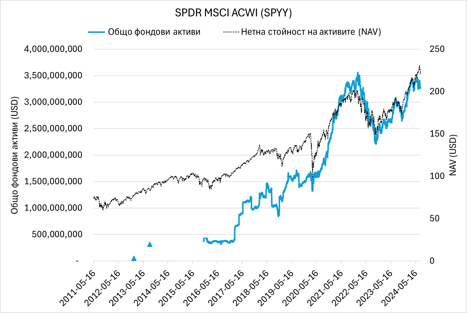 За разлика от чисто новия Amundi Prime All Country World (вече набрал размер над $1 млрд. и с още по-ниски разходи: 0.07%, акумулиращ тикер: WEBN), за SPYY има повече достъпни данни заради възрастта на фонда и възможността за сваляне на исторически данни в ниска резолюция от сайта на MSCI.