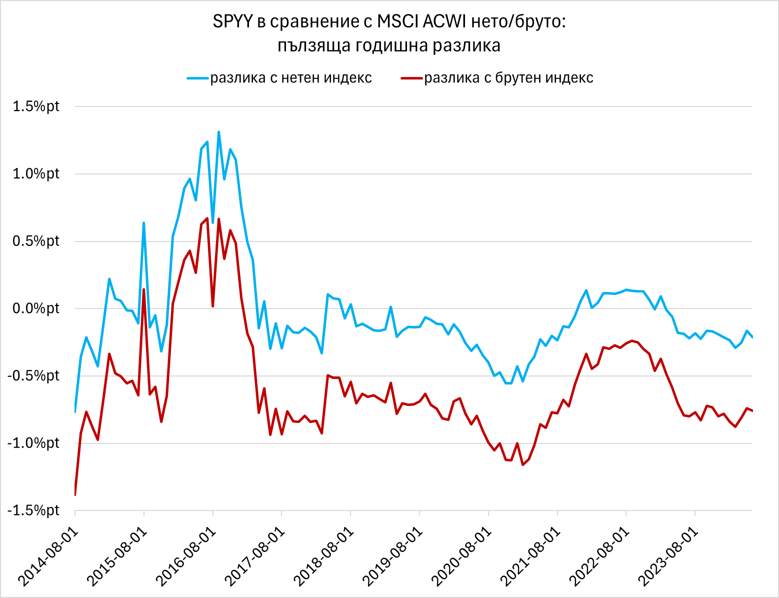 Разликата с нетния MSCI ACWI индекс (за пълзящ 12-месечен период) варира между +0.14 пункта и -0.56 пункта през последните 5 години. 3 годишната тракинг грешка е 0.16%. Разликата в доходността на годишна база (CAGR) спрямо нетния индекс за целия период от 5 години е -0.15 пункта (юни 2019- юни 2024). Тъй като разходите (TER) намаляват с разлика от 0.28 пункта (0.40%-0.12%), то изглежда, че SPYY по новата тарифа ще се движи около или може би малко над нетния MSCI ACWI индекс.
